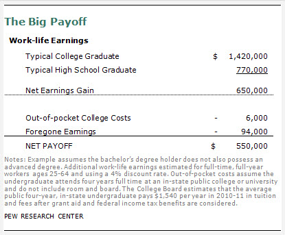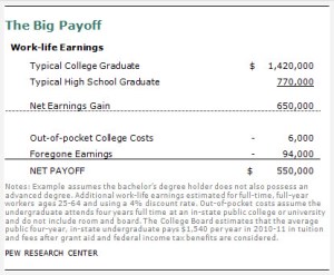 The Pew report stated that those who graduated from a four-year college believed they earn $20,000 more per year on average due to possessing a degree. Those estimates closely adhere to recent U.S. Census findings that show the average gap in earnings between college and high school graduates is $19,550.